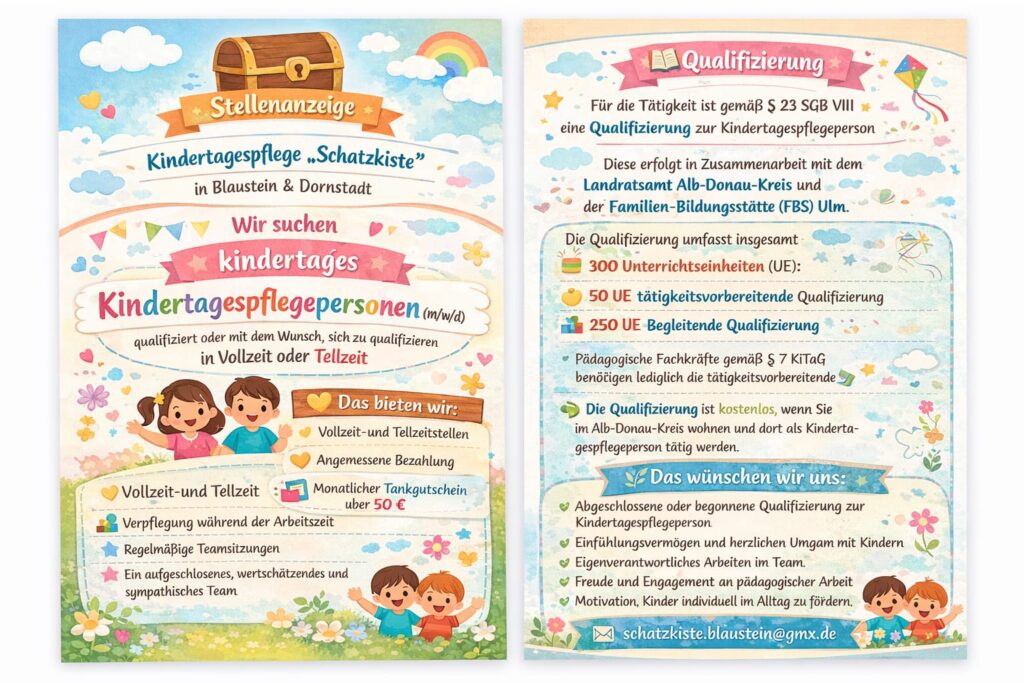 Für unsere familiäre und die liebevolle Kindertagespflege in Dornstadt und Blaustein suchen wir eine engagierte Kindertagespflegeperson, Kinderpflegerin oder Erzieherin mit gültiger Pflegeerlaubnis oder der Bereitschaft für Erwerb der Pflegeerlaubnis.